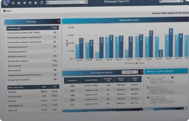 Wholesale Parts Pro está especialmente diseñado para mayoristas de piezas de recambio de automóviles que quieren fidelizar a sus clientes, volver a captar cuentas perdidas y liberar todo el potencial de sus territorios. Nuestro CRM especializado equipa a tu equipo con herramientas potentes y fáciles de usar, diseñadas para hacer crecer tu negocio, y que se amortizan con creces.